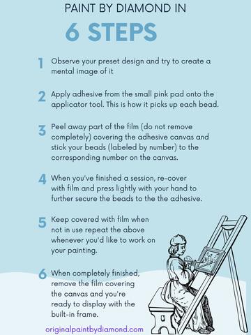 When completing your first Diamond Painting, start by observing your preset design and try to create a mental image of it. This can help you feel more comfortable with the design and personally this helps me clear up my thoughts before I start my creative process. Next, apply adhesive from the pad onto the applicator tool (this is how you pick up each bead). Then peel away part of the film (do not remove completely) covering the adhesive canvas and stick your beads (labeled by number) to the corresponding number on the canvas, easy! I've included the step-by-step process below for your convenience!