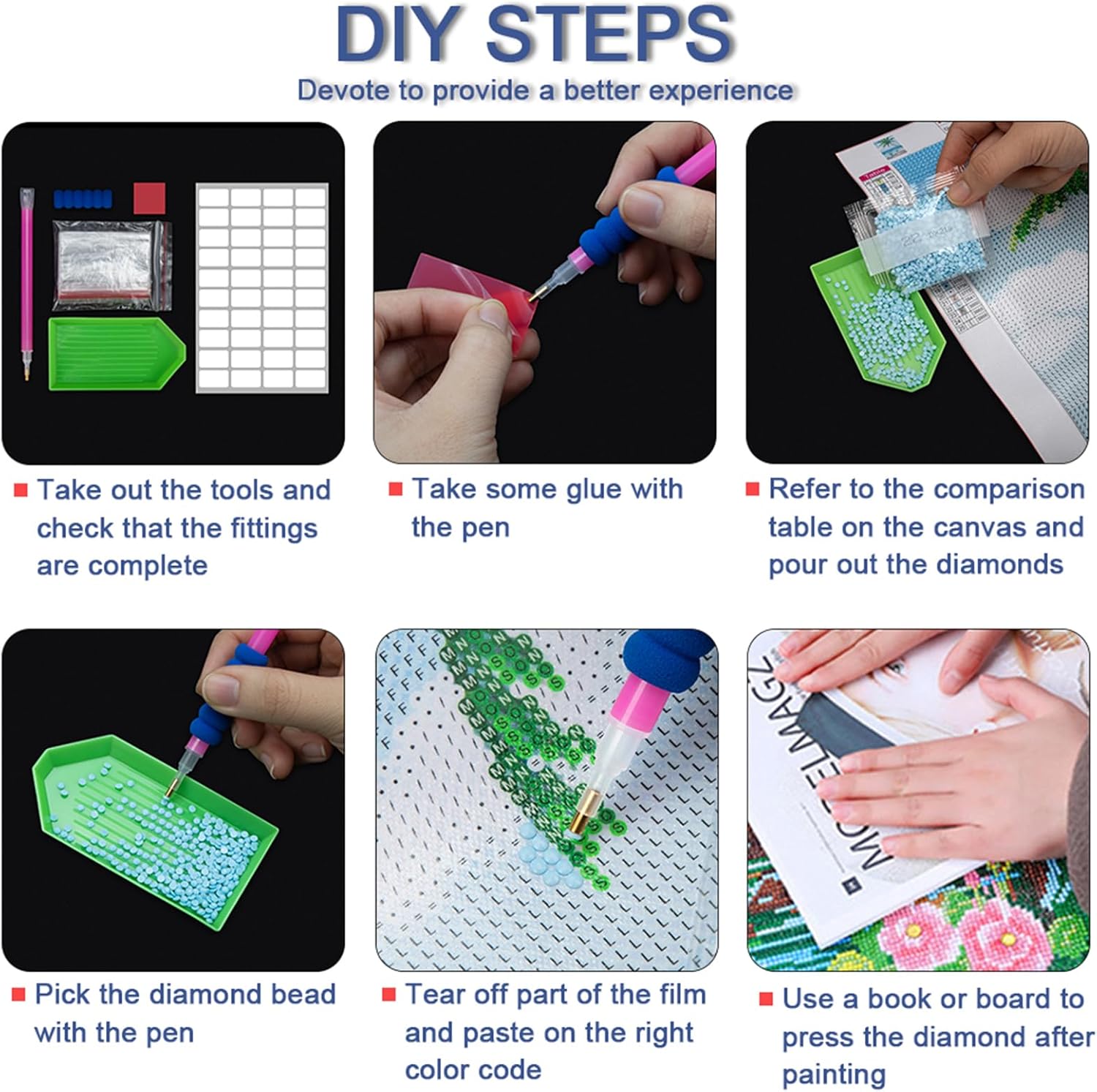 Complete Kit: Includes 1 pen, 1 diamond plastic tray, 2 wax pieces, 1 pen case, 10 transparent bags, and 1 set of 32 label stickers. Extra 25% diamond beads are provided to ensure you can complete your creation.