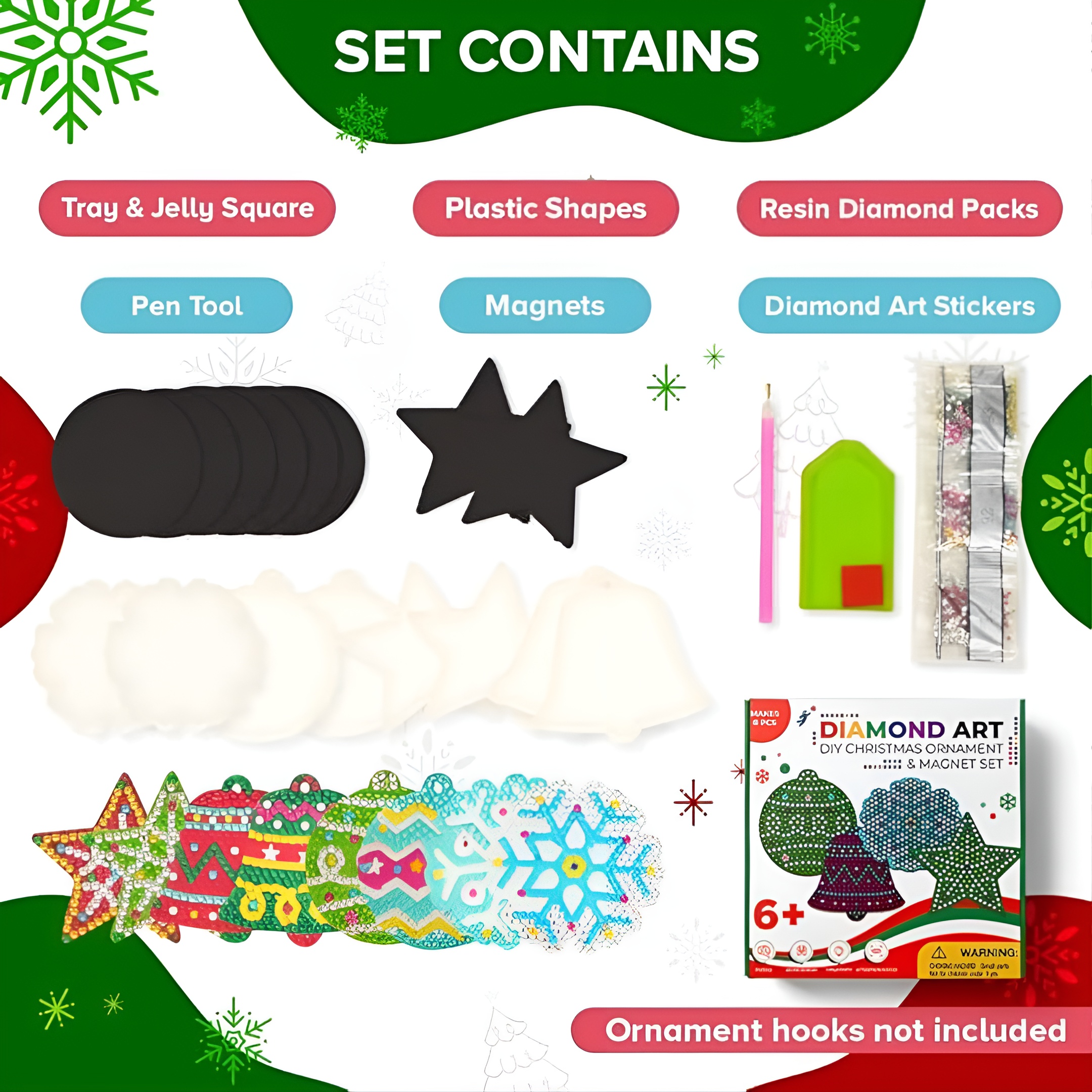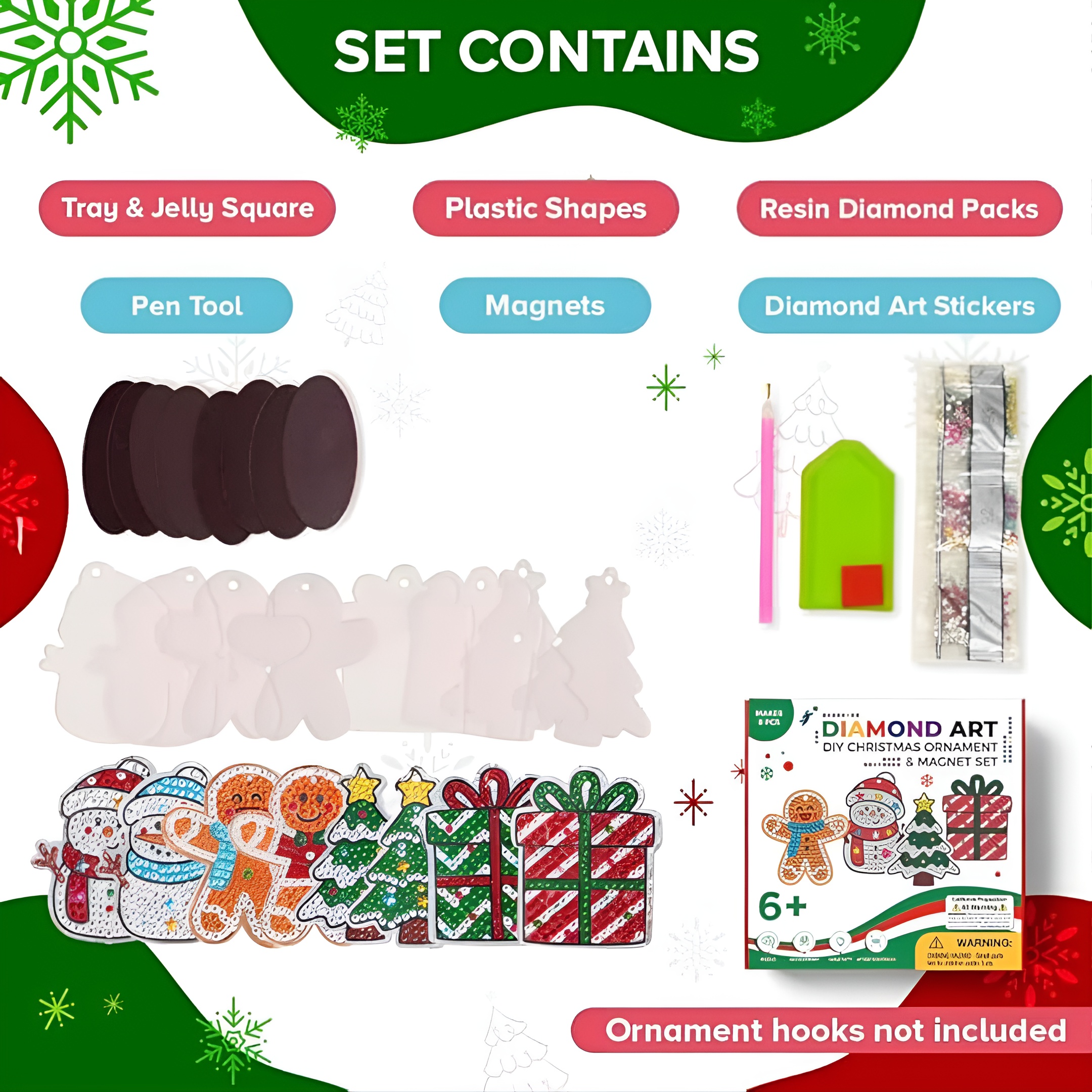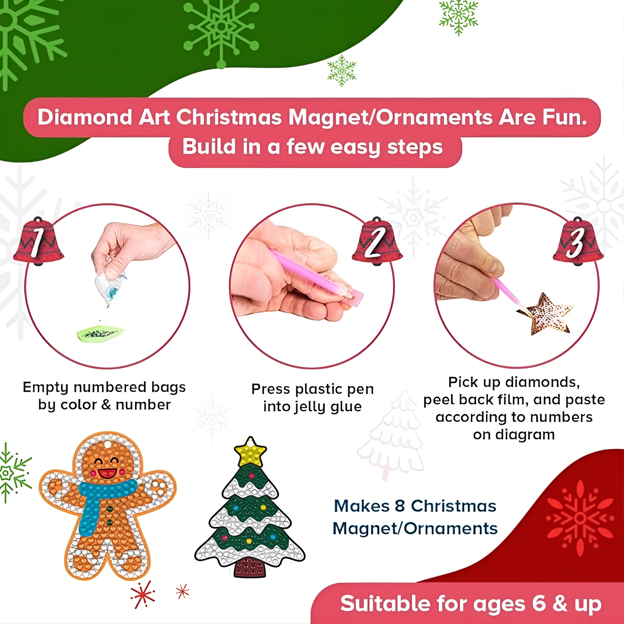 - Complete DIY Kit for 8 Ornaments: This set includes all the materials needed to create eight dazzling Christmas ornaments. The designs include a Christmas tree, gingerbread man, snowman, and presents. Each ornament is made with sparkling resin diamonds that add a look of shimmer to your holiday décor.