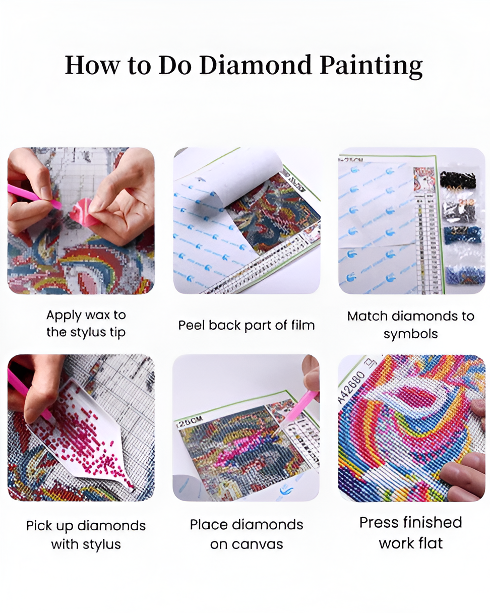 Once completed, gently press the surface using a clean roller or flat object to intact all diamonds evenly. Store the finished artwork away from excessive humidity and direct sunlight to preserve clarity and sparkle.