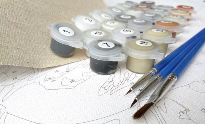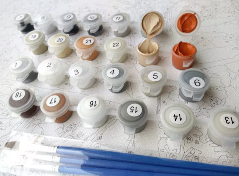Acrylic-based pigments come in separate containers. The set includes three brushes for small, medium, and larger sections. Each one is suited to a different part of the canvas, and the guide helps the user understand how to apply them correctly. The acrylic mixture is pre-prepared, and no additional materials are needed.