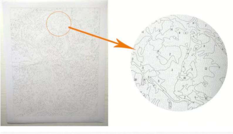The surface is linen-based with printed outlines and labeled areas to match each color in the included paint set. Users fill numbered areas with the corresponding paint, gradually turning the canvas into a complete piece. Every section on the canvas matches a paint code, making the process clear and organized.