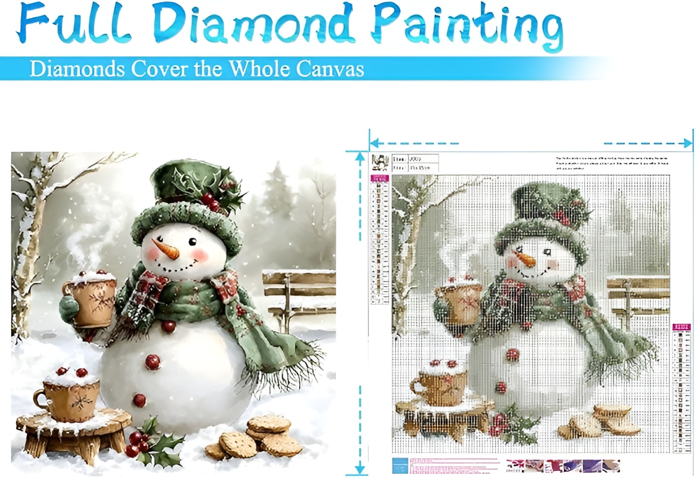 The Snowman Painting Kit provides a smooth canvas surface with marked drill zones. A larger painting area is included for better visibility and diamond placement.