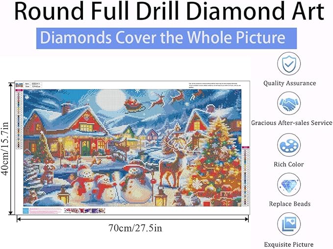 - Vibrant 5D Diamond Art: The DIY Santas Village Diamond Art Painting Kit design is a 5D diamond painting, which features round rhinestones that shimmer and shine under light, creating a sparkling effect. The bright and colorful diamonds add depth and dimension to the image, bringing Santa’s village to life.