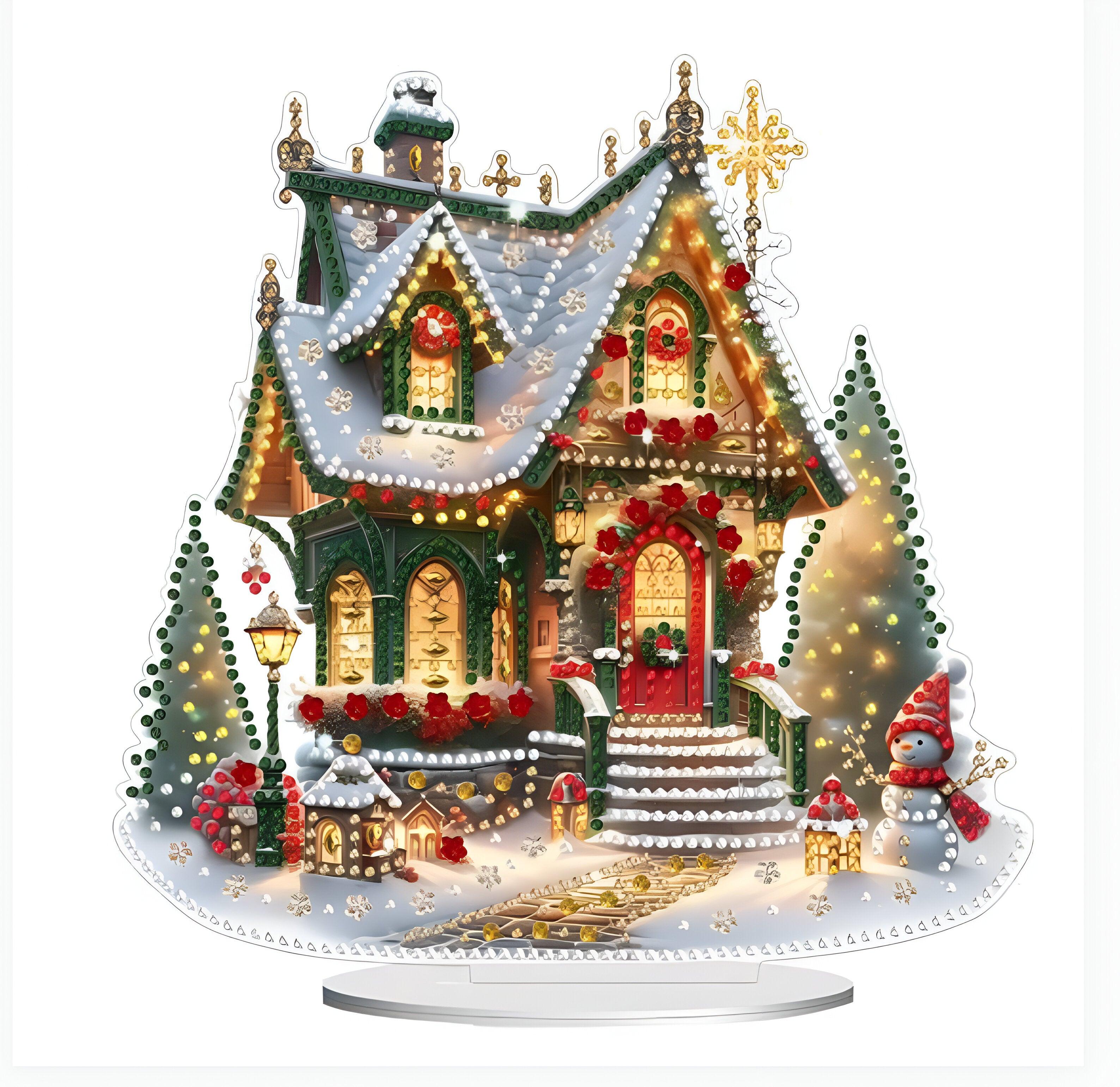 The Enchanting Christmas House Design Paint By Diamond Kit captures the warmth of the holiday season with a picturesque snow-covered house adorned with red wreaths, twinkling lights, and festive decorations. The scene is complemented by lit-up trees, a snowman, and cozy lanterns, creating a magical winter ambiance. Decorated with special-shaped and round rhinestones, the design sparkles with depth, accentuating details like the house, glowing lights, and falling snowflakes.