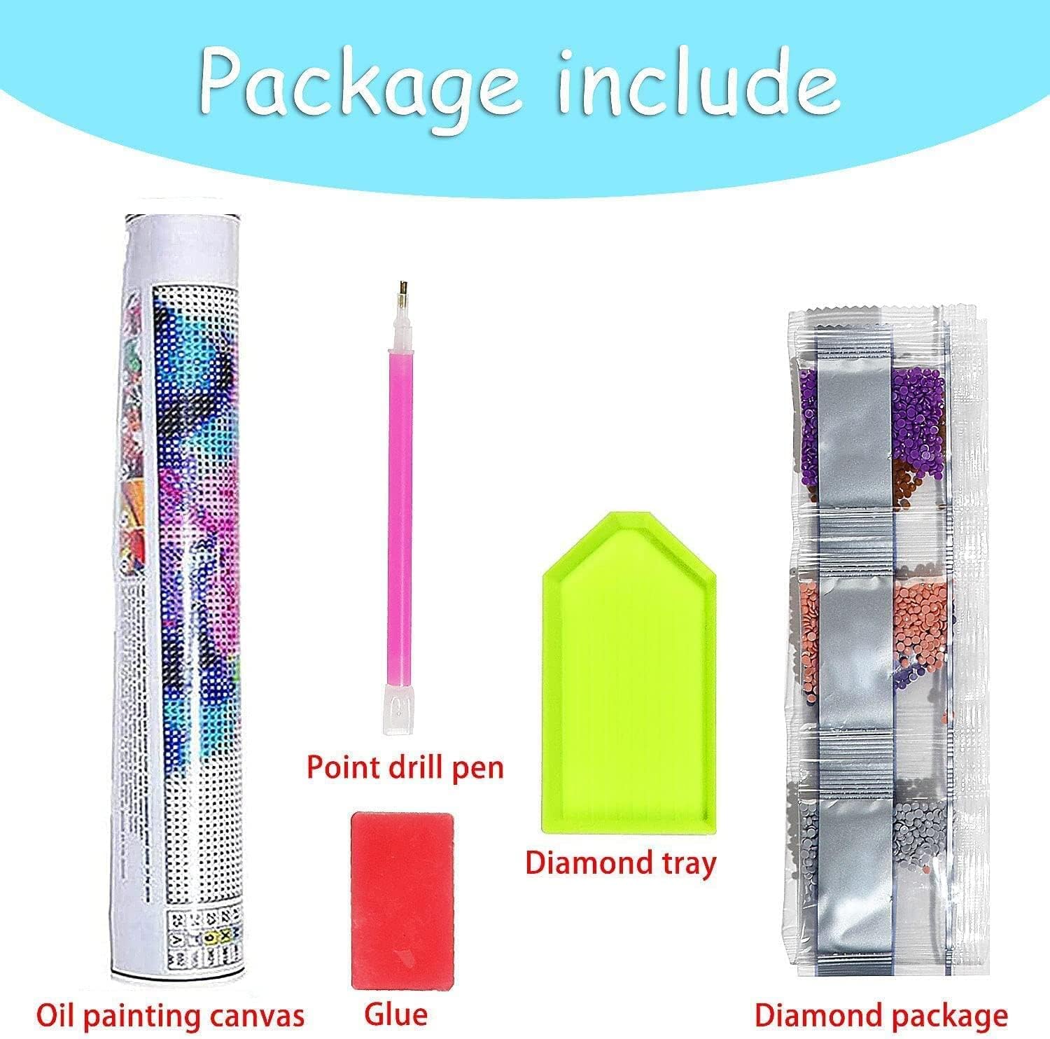- DIY diamond art kit with canvas, beads, pen, tray, and glue included.