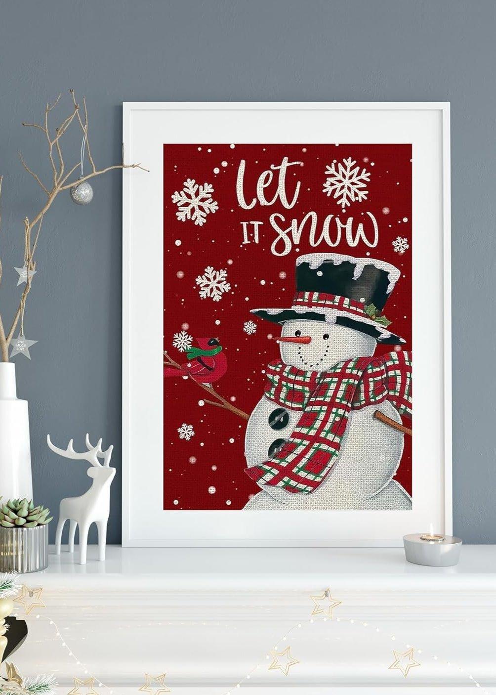 Holiday Design: Features a cheerful snowman in a plaid scarf and top hat, accompanied by a cardinal bird, with the text "Let It Snow" and snowflakes set against a festive red background.