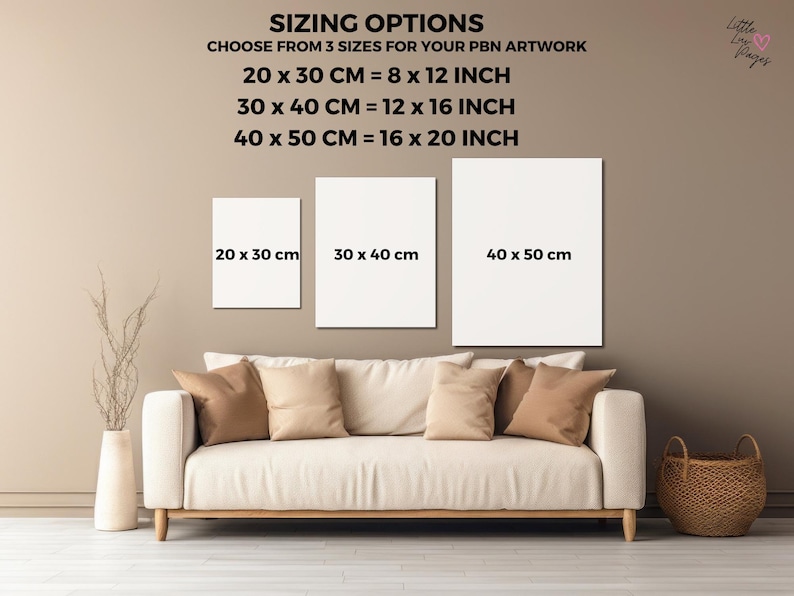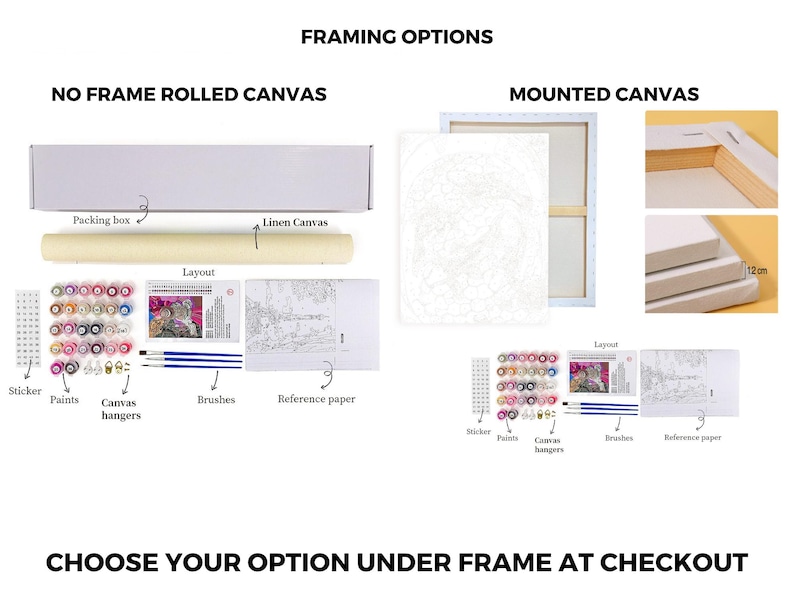 The textured canvas adds a quality feel and helps paint application look more even. The standard finished size is 40 cm x 50 cm, which fits many wall spaces. Larger sizes are available for a stronger visual effect. The frame is not included, but an optional DIY wood frame can be selected for easy display.