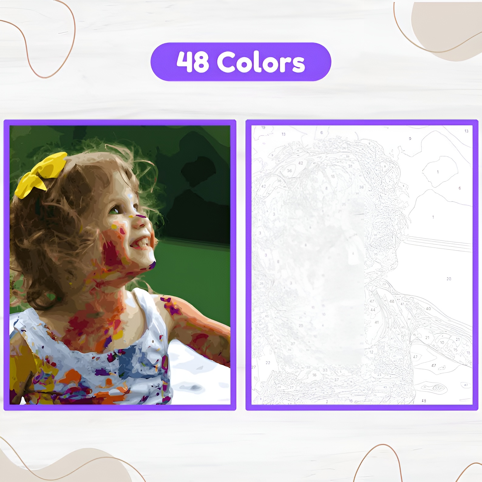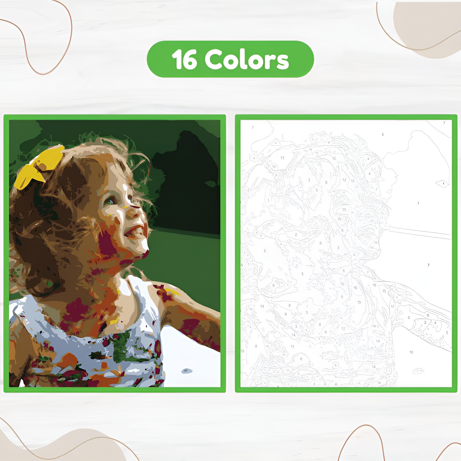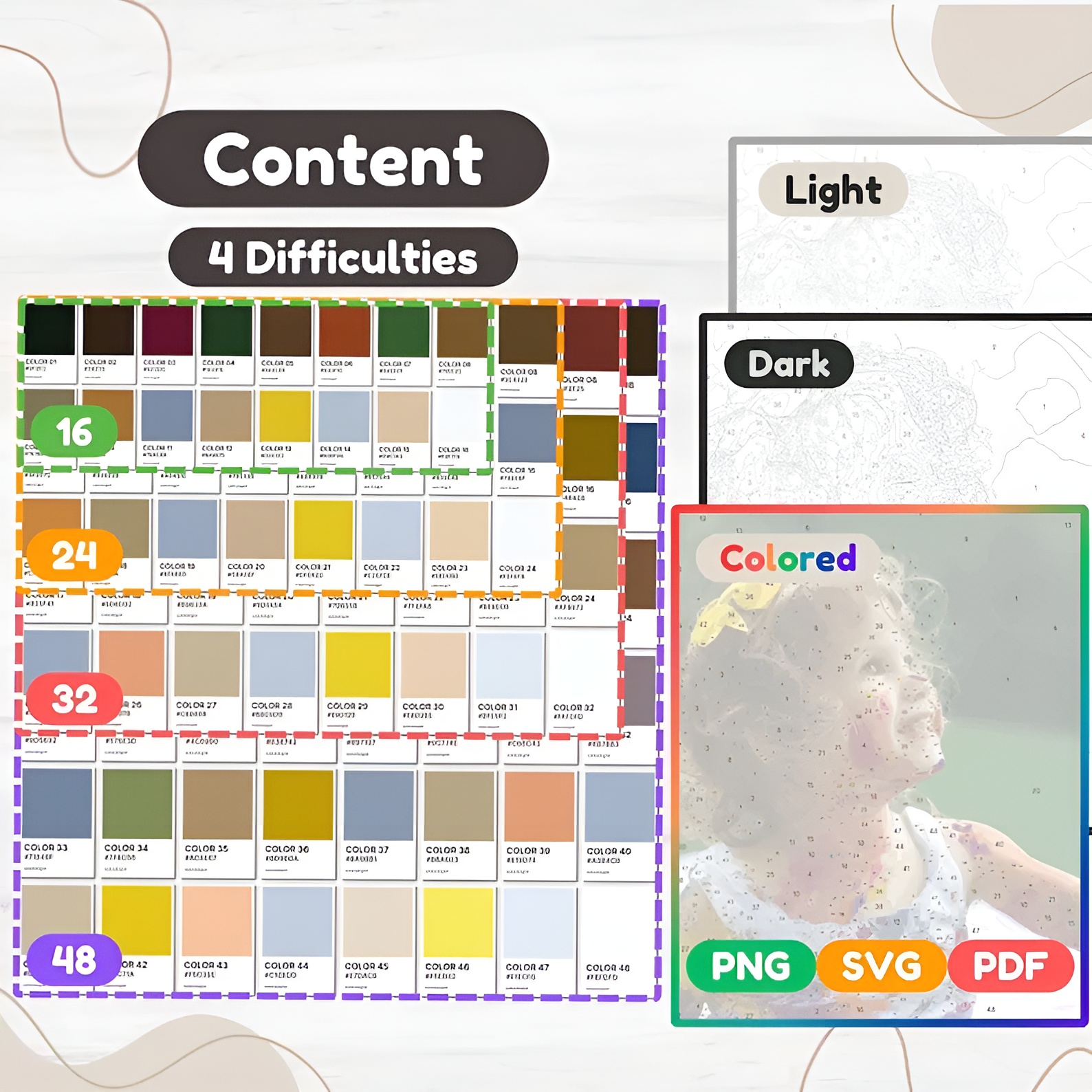 Every personalized color-by-number design includes four difficulty levels. You can choose between 16, 24, 32, or 48 colors. Each option changes the number of regions in the artwork.