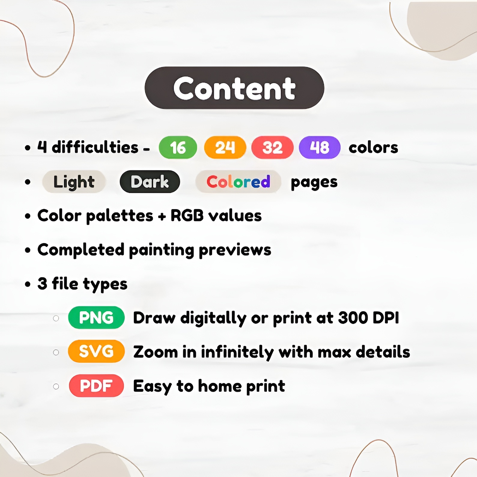 - PDF PNG SVG files for printing, resizing, and digital coloring