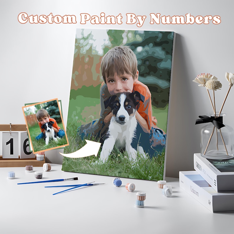 The Personalized Custom Family Pet Photo Paint By Number Kit is a meaningful, creative project designed to transform a cherished pet photo into a structured paint-by-numbers canvas. This artwork kit allows you to recreate a memorable moment with your family companion through a guided painting process. Each canvas is custom-prepared using your uploaded photo and converted into a clear numbered layout, making it accessible even for beginners.